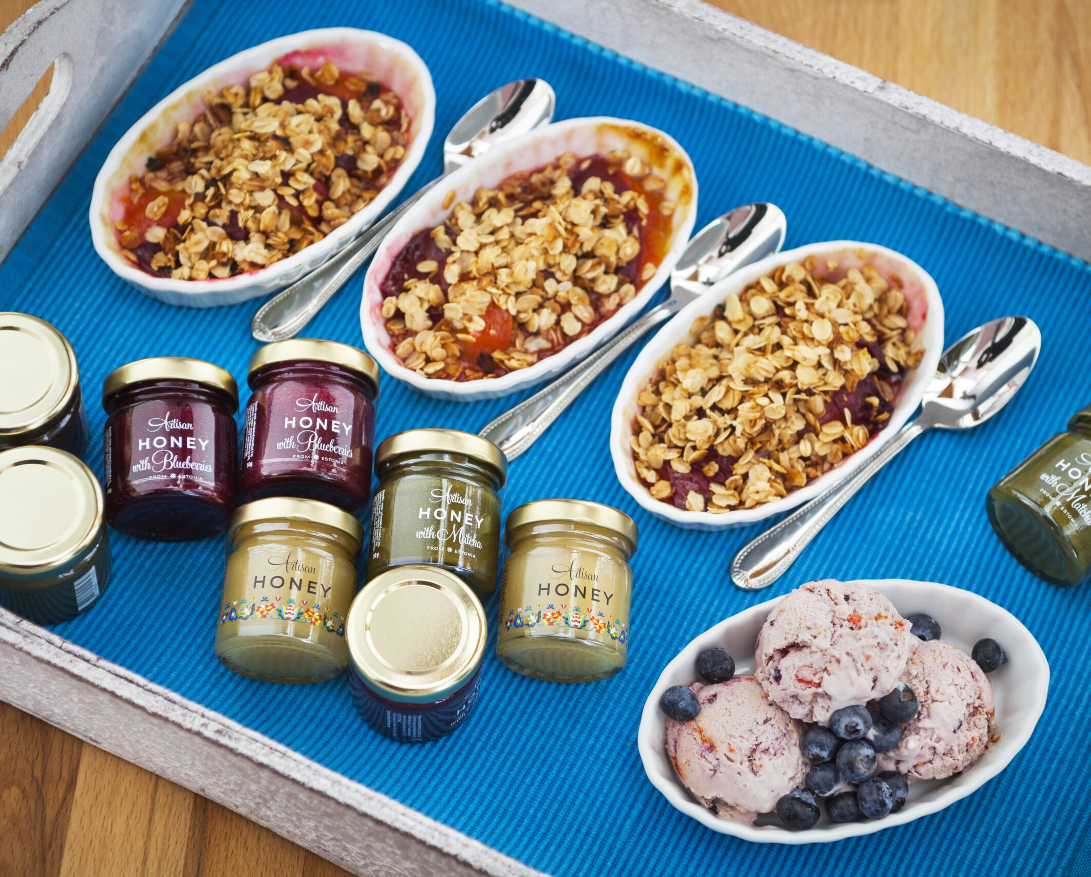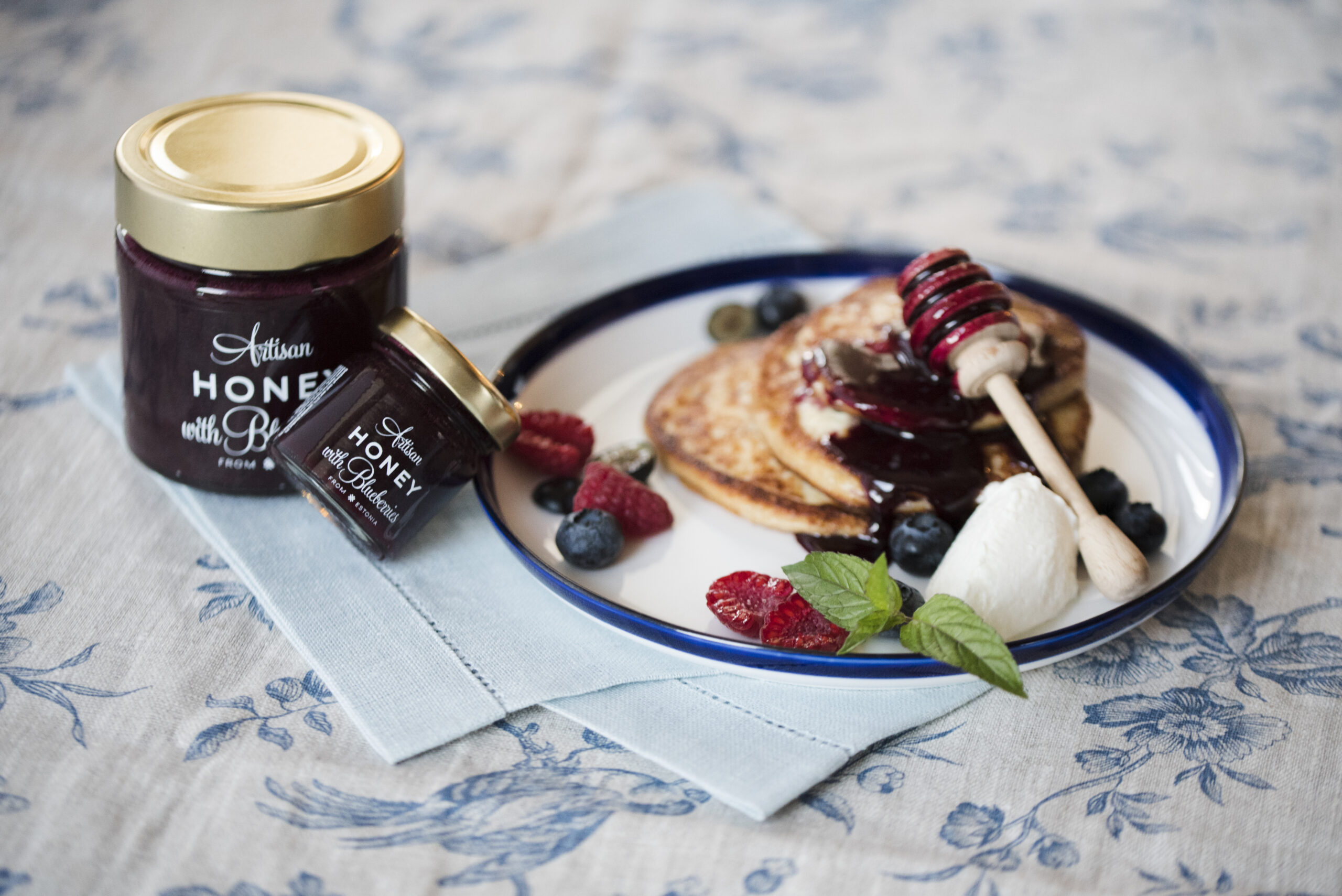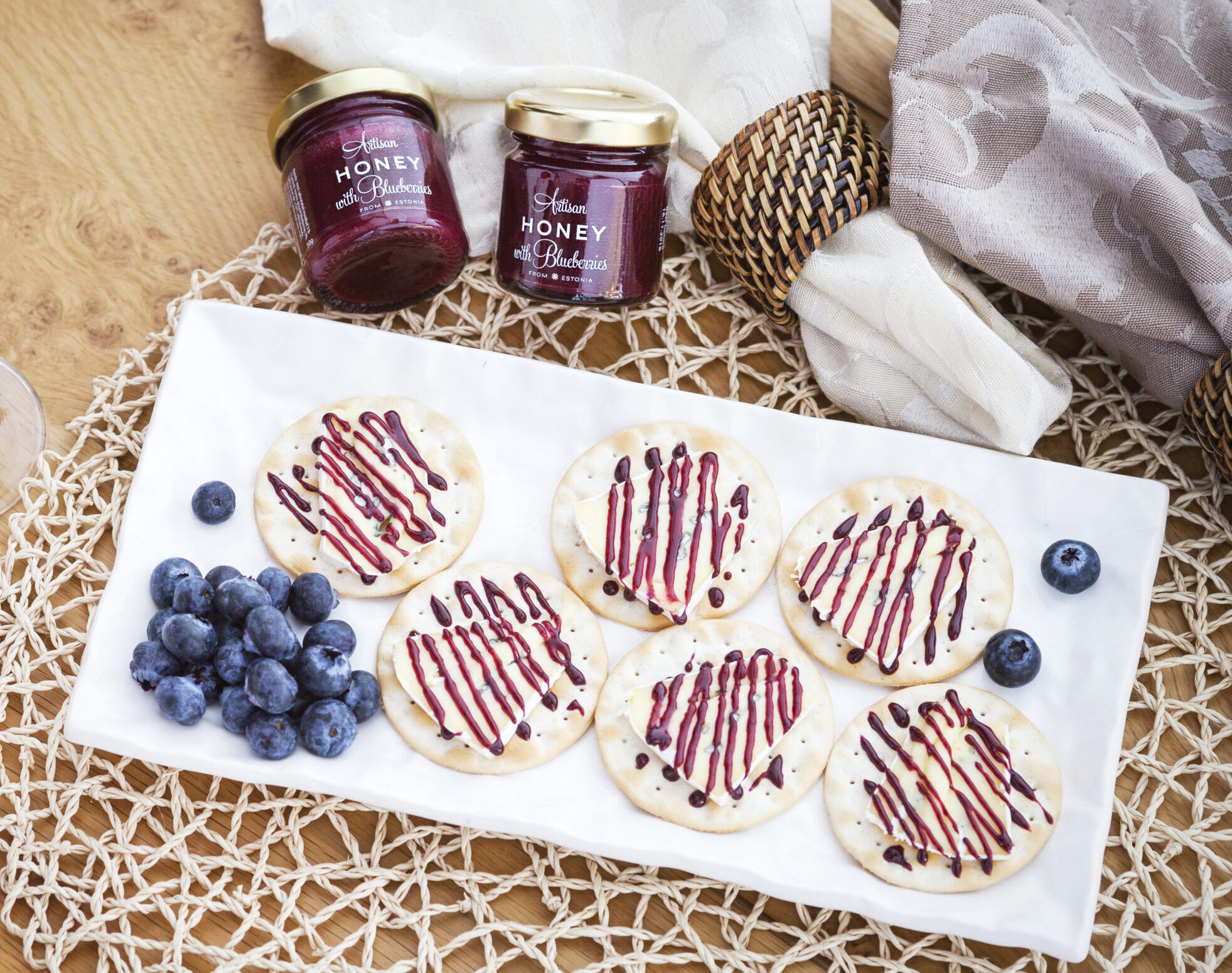 Cracker mit Käse und Honig mit Waldheidelbeeren